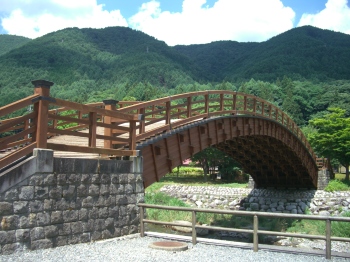 | 駐車場からこの木橋を渡ると中仙道奈良井宿に入る。 | |