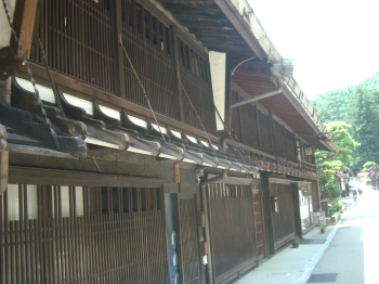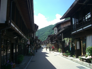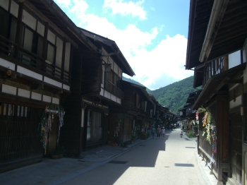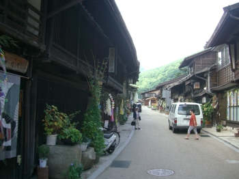 | 街道の両側の家の軒が張出しているのが特徴 | |