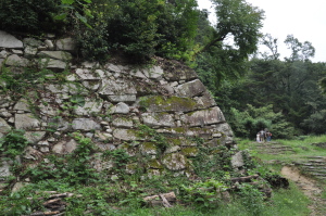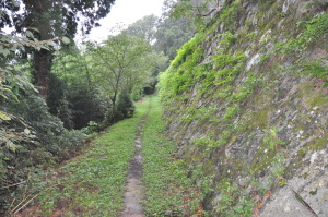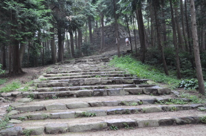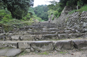 | 安土城の大手道。 立派な石段が延々と続く。石垣の段差が高い。 老人にはきつい。 |