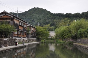 | 近江八幡城下の八幡堀です。 天正13年(1585年)に豊臣秀次(秀吉の甥)が八幡山に 城を築き開町したことに始まります。秀次は、 八幡堀と琵琶湖とを繋ぎ、湖上を往来する船を 城下内に寄港させることで、人、物、情報を集め、 さらに楽市楽座制を実施することで城下を大いに活気づけました。 |
