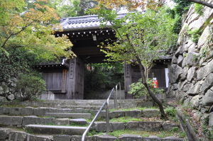 | 麓から有料道路を通って観音寺山の9合目の駐車場があり 観音正寺の登り口に到着する。琵琶湖の東岸、標高433メートル の繖山(きぬがさやま)の山頂近くに位置する天台宗の寺。 寺は戦国武将佐々木六角氏の庇護を得て栄えた。しかし信長軍の 攻撃で焼き打ちで全焼。再建されたのは江戸慶長年間。 |