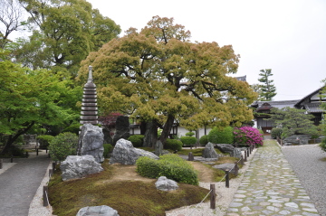 | 門をくぐると手入れの行き届いた庭木に 迎えられて、石だたみがまっすぐ続く。 |