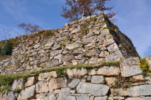 縄張りの規模は南北400メートル、東西100メートルにおよび、完存する石垣遺構としては全国屈指のもので、平成18年には日本城郭協会により「日本100名城」に選定されました。自然石を巧みに配置した近江穴太衆(おうみあのうしゅう)による石垣は、400年を経た今でも当時の威容を誇っています。