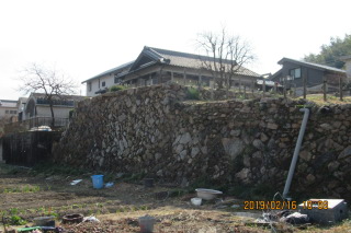 | 本陣跡に残る立派な石垣。北側の畑を囲って石垣が残っている。 | |
